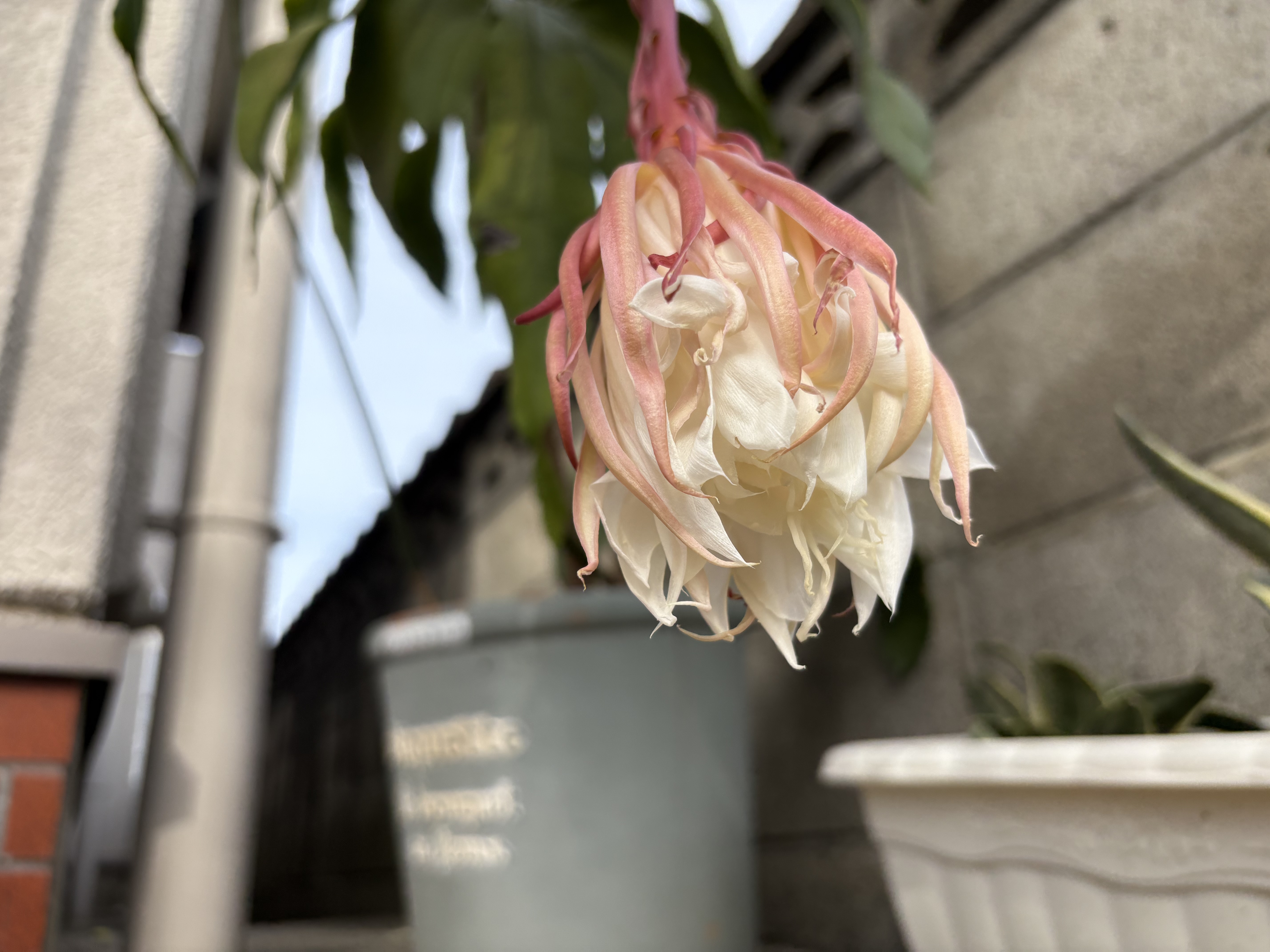 患者様から月下美人の鉢を頂きました。もう蕾の状態で注意深く観察していたら満開とまでは行かなかったけど咲いてくれました。とても貴重な花ありがとうございました、大切に育てます。